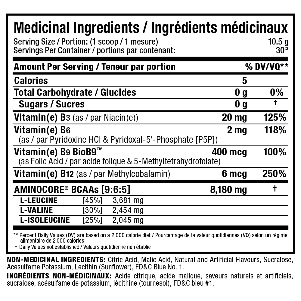AMINOCORE delivers 8.18g of BCAA in a 45:30:25 ratio clinically proven to provide a 350% increase in activation of muscle growth signals. The purest, free-form source of BCAA, AMINOCORE has no added fillers or non-BCAA aminos. AMINOCORE’s BCAAs are 100% pure prior to flavoring. Typical 2:1:1 sources contain impurities resulting in cloudiness, oily foam, sediment, and the worst – a harsh bitter taste! AMINOCORE is the cleanest, purest, best-tasting BCAA supplement money can buy.