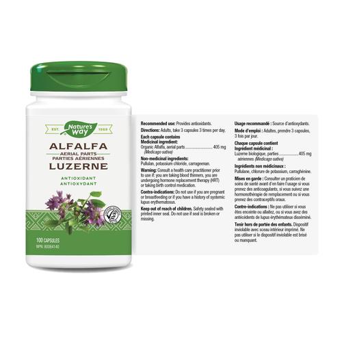 Nature's Way Alfalfa provides antioxidants. The active ingredient is organic and is sourced from the aerial parts (leaves) of the plant that deliver the highest antioxidant benefit. Nature's Way Alfalfa is Vegetarian, TRU-ID certified and non-GMO Project verified.