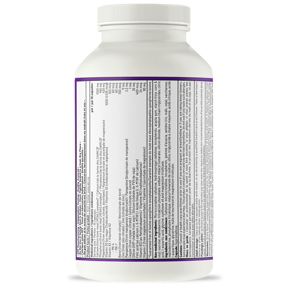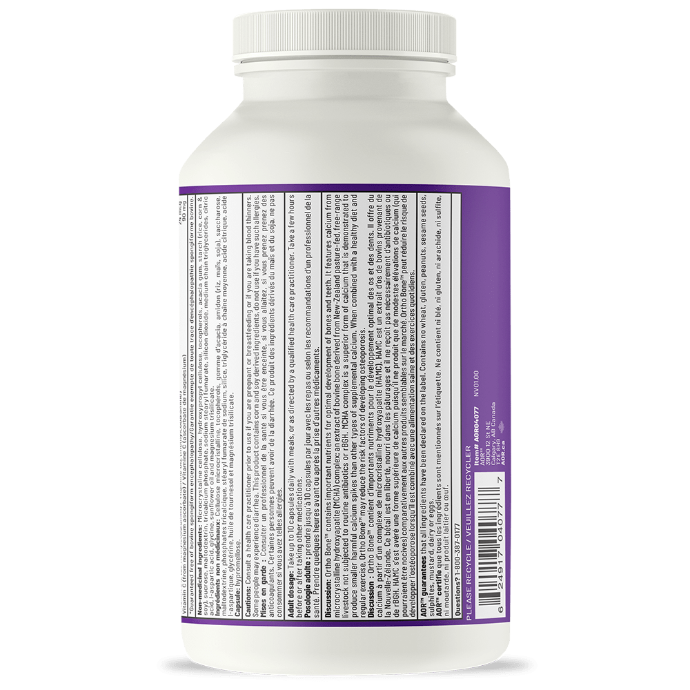 Ortho Bone™ is an advanced bone health formula providing nutrients that are fundamental for mineral deposition in bone and for regulating the excretion of minerals. These nutrients are very important for those with osteoporosis, osteopenia or a history of bone fractures. Ortho Bone™ is unique because it serves not only to reduce bone loss but to maintain or even increase bone growth, something that most calcium supplements are unable to achieve. This is due to the key ingredient, a superior source of calcium called microcrystalline hydroxyapatite complex (MCHC), which comes from New Zealand bovine bone. MCHC contains more than calcium: it contains all of the minerals and proteins found in bone, is rich in phosphorus, and provides growth factors that stimulate bone growth. It is digested more slowly in the stomach than typical calcium supplements, resulting in smaller spikes in blood calcium levels, which allows the calcium to be better absorbed into the bones.