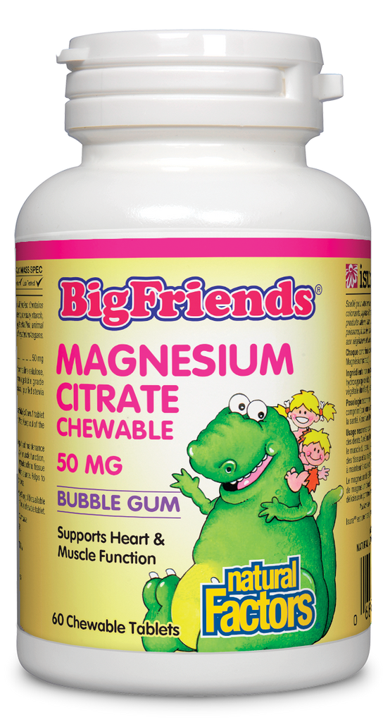 BigFriends Magnesium Citrate provides an easy, chewable way to support childrenÕs healthy growth and development. Each delicious bubble gum-flavoured chewable tablet contains 50 mg of magnesium citrate needed to support proper energy metabolism, tissue formation, muscle function, and bone development. This easy-to-take one-per-day formula is gently sweetened with xylitol and stevia.