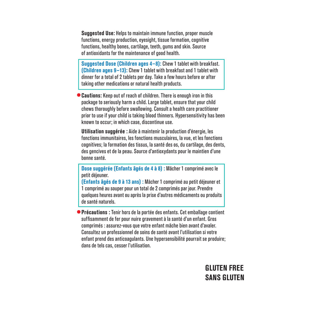 As a factor in the maintenance of good health, children (4?8 years) chew 1 tablet daily with breakfast. Children (9–13 years): Chew 1 tablet with breakfast and 1 tablet with dinner for a total of 2 tablets per day. Take a few hours before or after taking other medications.