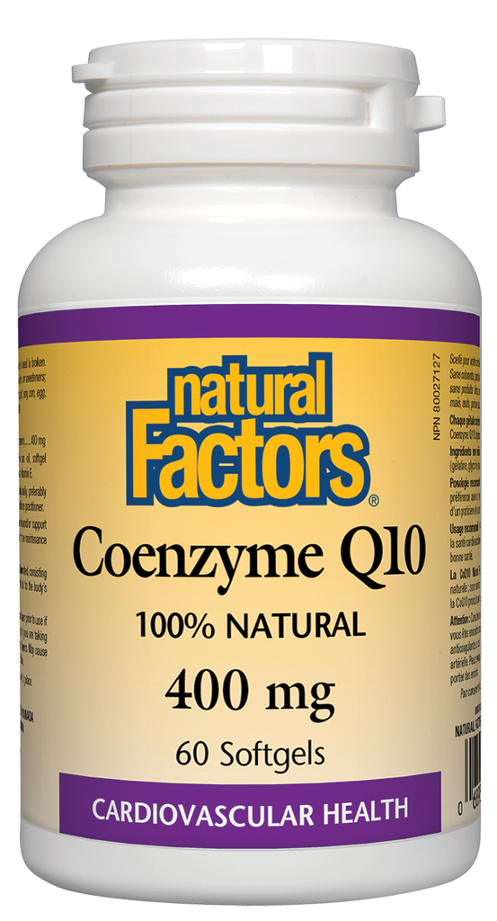 Coenzyme Q10 is a vitamin-like essential nutrient that helps increase levels of cellular energy production and is required by every cell in our body. Known to support cardiovascular health and cellular vigour. Natural Factors Coenzyme Q10 400 mg is 100% natural, consisting of the form identical to the body's own CoQ10.