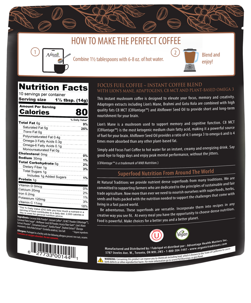 Organic Traditions Focus Fuel Coffee is an instant coffee blend with lion's mane mushroom, adaptogens, c8 MCT and plant-based omegas. This instant coffee blend is dairy free, made with our signature coconut milk powder and provides you with an energizing, brain-nourishing formula with adaptogens and quality fats. Organic Traditions Focus Fuel Coffee support focus, memory and creativity. Are you ready to get focused?