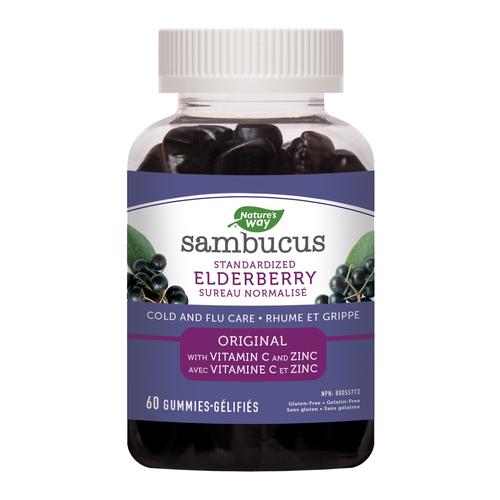 Nature's Way Sambucus Cold and Flu Care Original Gummies is traditionally used in Herbal Medicine to help relieve symptoms of colds and flus. These delicious tasting elderberry gummies contain 50 mg of Black Elder, 90 mg of Vitamin C and 7.5 mg of Zinc for each serving of two gummies. The addition of Vitamin C and Zinc also provide immune support. Bonus? It's a taste everyone will love and the gummies are gluten-free and gelatin-free.