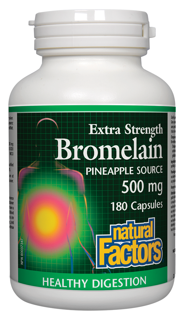Natural Factors Extra Strength Bromelain capsules contain the highest amount of enzyme activity per capsule. Bromelain is a proteolytic enzyme that breaks down proteins into various amino acids during digestion. It also has superior anti-inflammatory properties, and plays a role in allergy control.