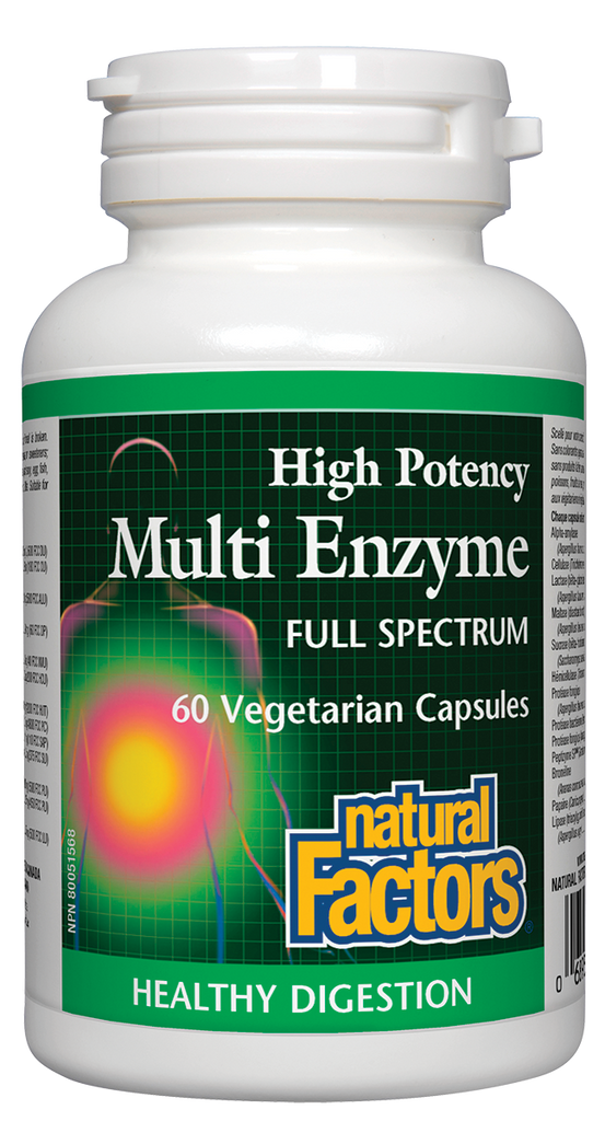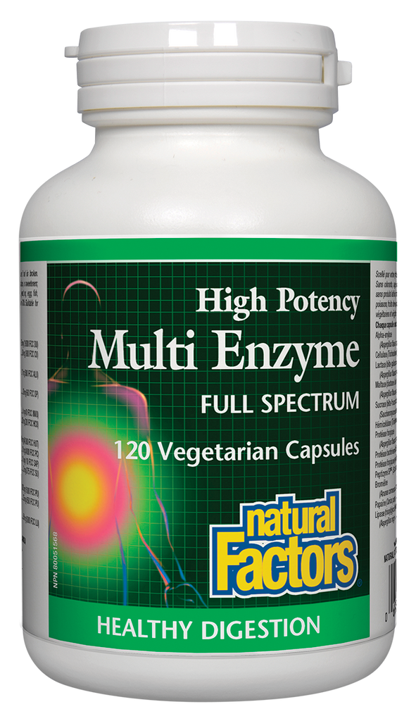 Natural Factors High Potency Multi Enzyme is an enzyme blend specially formulated to support digestion. These enzymes help break down proteins, carbohydrates, and fats to improve nutrient absorption and support beneficial gut bacteria. This vegan-friendly formula supports the digestion of fermentable carbohydrates (FODMAPs) found in beans and whole grains to help reduce gas and discomfort.