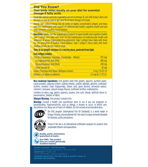 A potent, super-concentrated fish oil supplement with 1175 mg of omega-3 fatty acid in each capsule to help maintain good overall health and support a healthy mood balance, cardiovascular health, brain function and cognitive health. HEART AND BRAIN: Supports cardiovascular health and helps to reduce serum triglycerides. OMEGA 3: 1175 mg of omega-3 fatty acid in each capsule. SIMPLE DAILY USE: Convenient, once-a-day, 100% fish-derived softgel capsule ENTERIC COATED: Made with enteric coated capsules to help ensure no “fishy burps” or aftertaste QUALITY CHECKED: All Renew Life® omega-3 supplements are free from harmful contaminants and have been rigorously third party tested and certified to ensure you are receiving clean, high-quality omega-3 fish oils. Each Renew Life® fish oil product carries both the Friend of the Sea® and International Fish Oil Standards (IFOS)™ certifications.