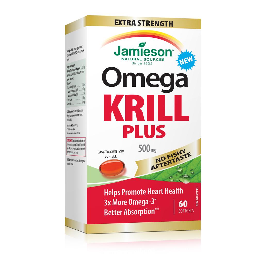 Jamieson Extra Strength Omega Krill Plus is a superior blend of 100% pure Antarctic krill and premium fish oil to help promote heart health, all without the fishy after taste or burp back!