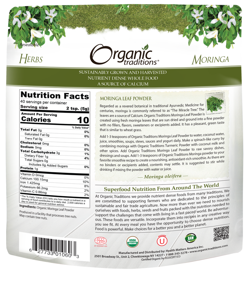 Moringa is a tropical flowering plant with many different species ranging from small shrubs to massive trees. Native to India, the Moringa oleifera is the most widely consumed of the 13 species, noted for its numerous nutritional benefits. Affectionately referred to as the Miracle Tree, Moringa has been a revered botanical in both traditional Ayurvedic and Siddha Medicine for centuries. All parts of the tree have been traditionally used such as the roots, leaves, flowers, seeds and pods.