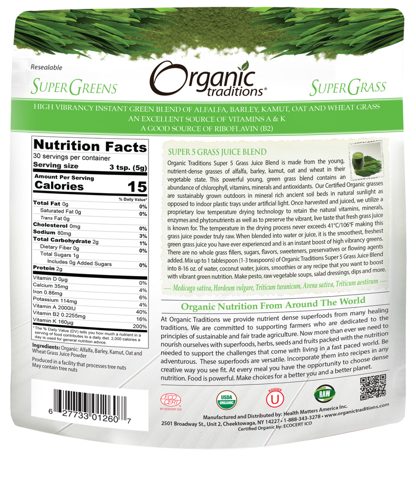 Organic Traditions Super 5 Grass Juice Blend is made from the young, nutrient-dense grasses of alfalfa, barley, kamut, oat and wheat in their vegetable state. These powerful young green grasses contain an abundance of chlorophyll, vitamins, minerals and antioxidants. Our Certified Organic grasses are sustainably grown outdoors in mineral rich ancient soil beds in sunlight as opposed to indoor plastic trays under artificial light. Grasses grown in the fresh wind kissed by natural sunlight are more vibrant than indoor grown grass. There is a real difference that you can taste and feel!