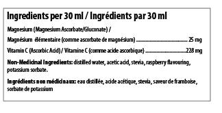 Magnesium (Magnesium Ascorbate/gluconate) 25 mg, Vitamin C (Ascorbic Acid) 228 mg, distilled water, acetic acid, stevia, raspberry flavouring, potassium sorbate.