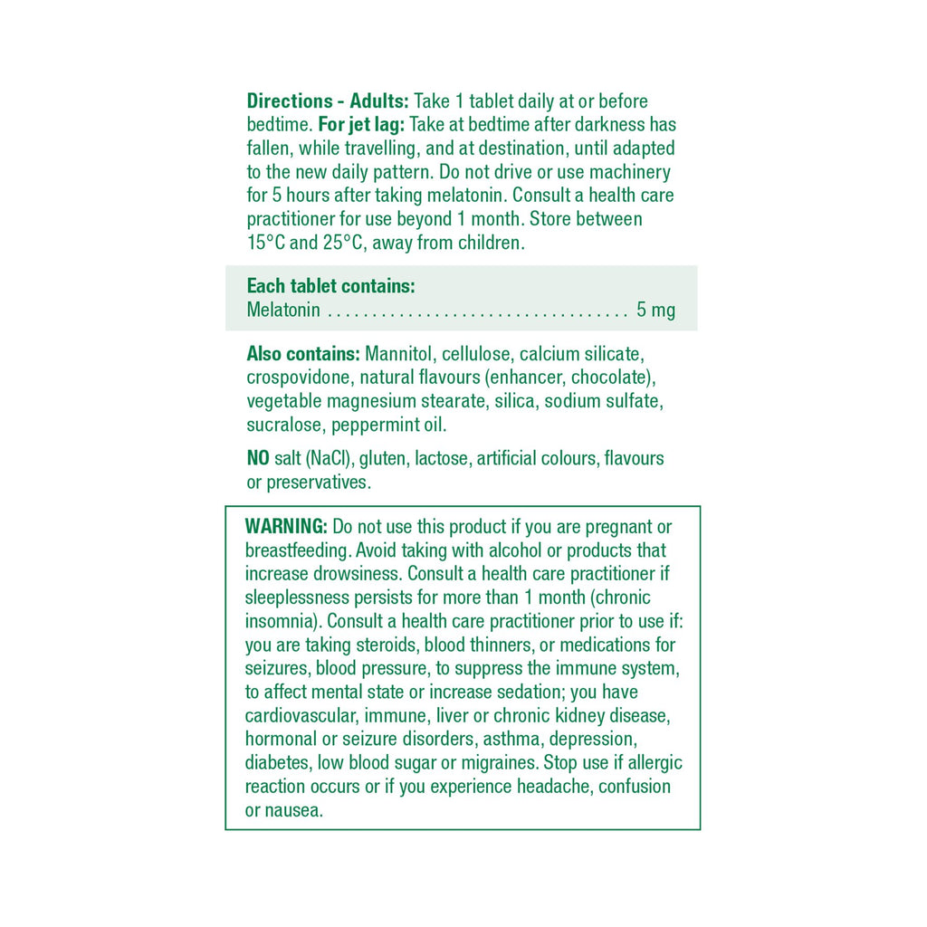 Adults: Take 1 tablet at or before bedtime. Do not drive or use machinery for 5 hours after taking melatonin. Consult a healthcare practitioner for use beyond 1 month. For jet lag: For occasional short-term use, take once a day at bedtime after darkness has fallen while travelling, and at destination, until adapted to the new daily pattern. Store between 15°C and 25°C, away from children.