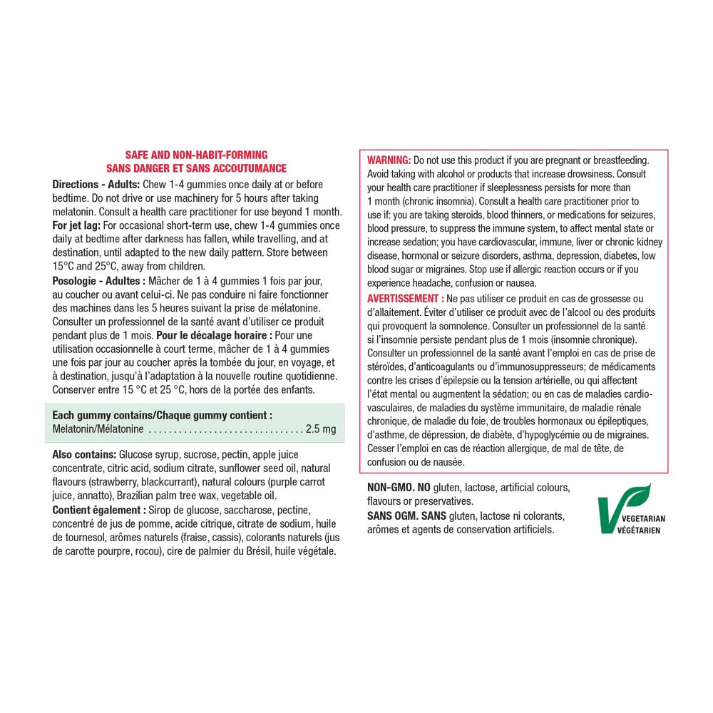 Adults: Chew 1-4 gummies once daily at or before bedtime. Do not drive or use machinery for 5 hours after taking melatonin. Consult a health care practitioner for use beyond 1 month. For jet lag: For occasional short-term use, chew 1-4 gummies once daily at bedtime after darkness has fallen, while travelling, and at destination, until adapted to the new daily pattern. Store between 15°C and 25°C, away from children.
