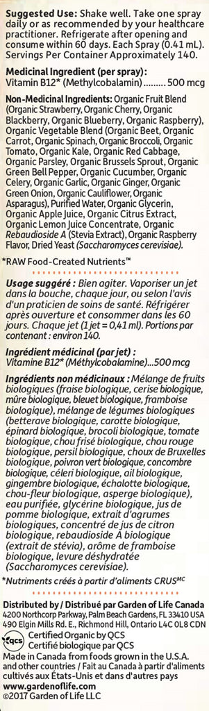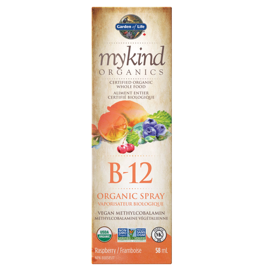 mykind Organics B-12 Organic Spray is a delicious raspberry spray made with organic foods and herbs. One spray daily delivers 500 mcg of vegan vitamin B-12 as methylcobalamin from Saccharomyces cerevisiae to boost energy, support metabolism and promote formation of healthy red blood cells and DNA synthesis. Made without any artificial ingredients or chemical preservatives and no added sugars —just wholesome food with delicious organic flavour and organic stevia.