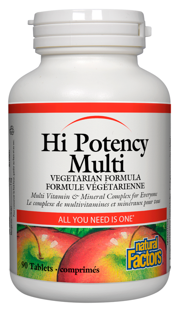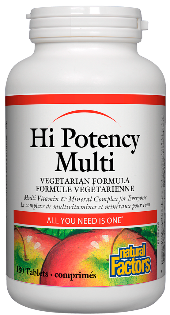 Natural Factors Hi Potency Multi supplies a broad spectrum of vitamins, minerals, lipotropic factors, and synergistic nutrients. This vegetarian formula provides higher levels of B complex vitamins, vitamin C and includes iron. Hi Potency Multi is an excellent one-per-day multivitamin/mineral tablet for adults with active and busy lifestyles.