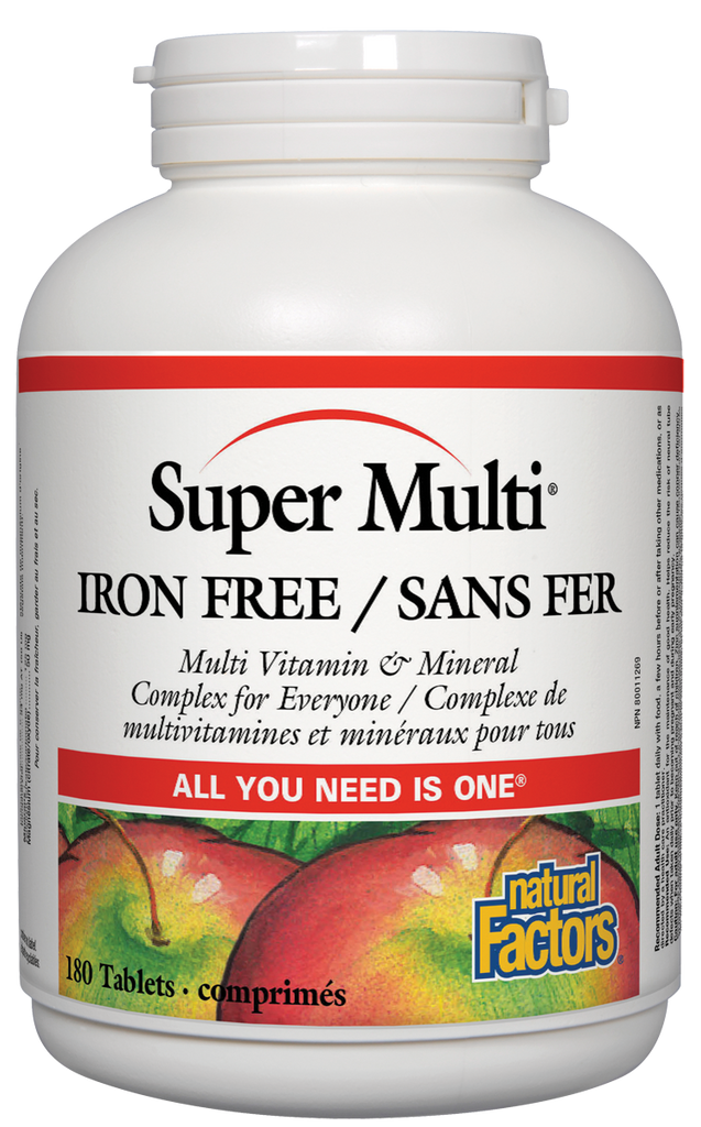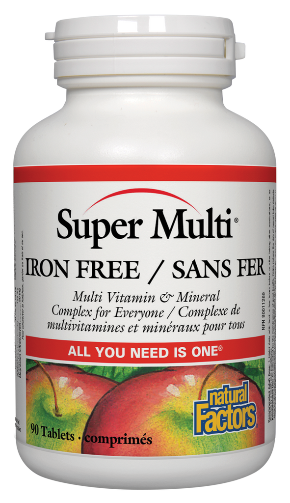 Natural Factors Super Multi Iron Free supplies a broad spectrum of vitamins, minerals, and synergistic antioxidants from citrus bioflavonoids, rutin, and hesperidin. This is an excellent medium strength one-per-day multivitamin/mineral tablet ideal for men, menopausal women, and others not requiring iron.