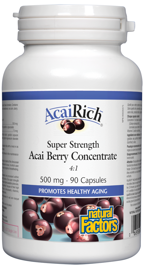 Natural Factors AcaiRich Super Strength Acai Berry Concentrate has a rich polyphenol content which counteracts free radicals to help lower cholesterol, reduce the risk of chronic disease, and promote healthy aging. Harvested from wild organic acai berries, this concentrate is a 4:1 potency, delivering one of the highest potencies available.