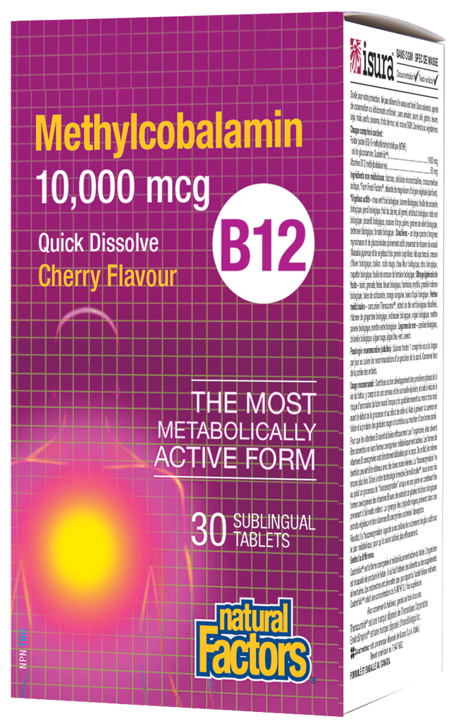 Natural Factors Methylcobalamin B12 provides 10,000 mcg of vitamin B12 in its most bioactive form. This one-a-day sublingual formula supports the normal function of the immune system, energy metabolism, red blood cell formation, and helps maintain good health. Methylcobalamin demonstrates exceptional activity immediately upon absorption over other forms of B12 such as cyanocobalamin.