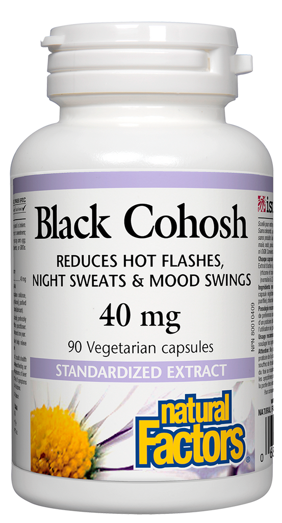 Black Cohosh helps restore balance of hormone levels for effective relief from the symptoms of menopause and perimenopause. Natural Factors Black Cohosh delivers 40 mg of standardized herb per capsule to guarantee 2.5% tripterpene glycosides, the main active constituent in black cohosh responsible for balancing hormones and relieving symptoms.
