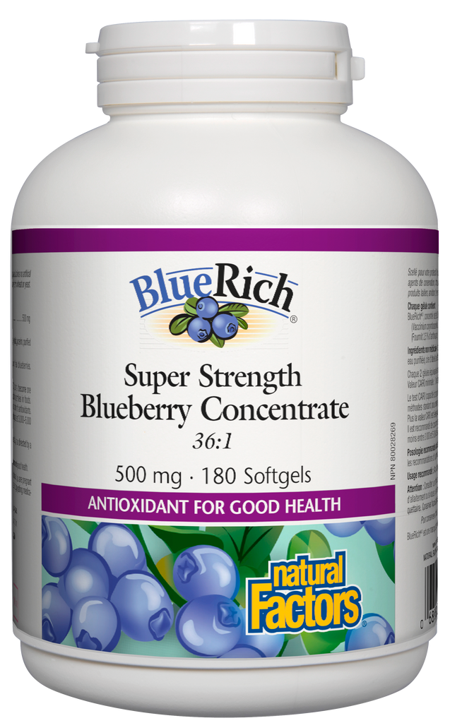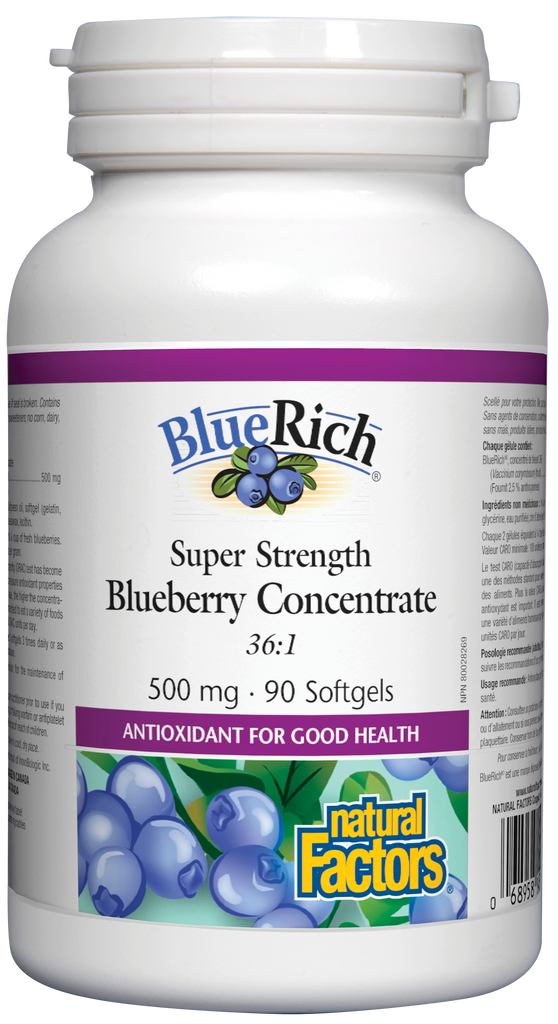 Blueberries support vision, slow premature aging, combat cognitive decline, and help prevent urinary tract infections, thanks to anthocyanins, the high ORAC (oxygen radical absorbance capacity) antioxidants in blueberries. Natural Factors BlueRich is a super strength 36:1 concentrate made from whole Canadian-grown blueberries, and provides the entire spectrum of blueberry nutrients.