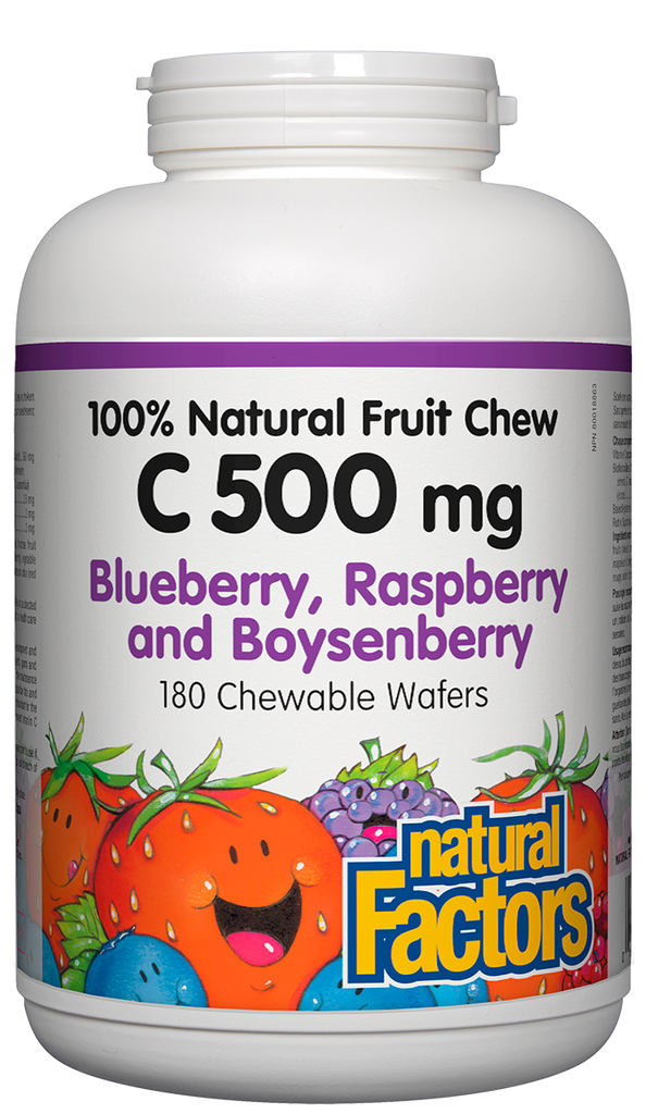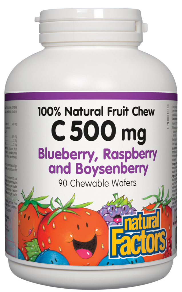 Natural Factors 100% C 500 mg natural fruit chews are an easy-to-take formula to help in the development and maintenance of bones, cartilage, teeth, gums, and connective tissue formation. Each wafer also contains citrus bioflavonoids, rosehips, and rutin for increased absorption and therapeutic benefits.