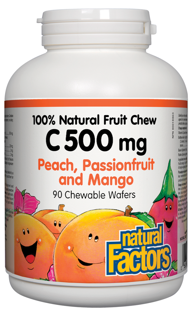 Natural Factors 100% C 500 mg natural fruit chews are an easy-to-take formula to help in the development and maintenance of bones, cartilage, teeth, gums, and connective tissue formation. Each wafer also contains citrus bioflavonoids, rosehips, and rutin for increased absorption and therapeutic benefits.