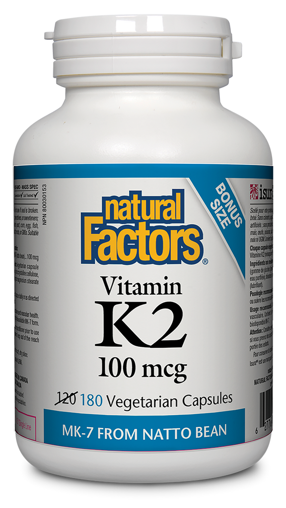 Natural Factors Vitamin K2 contains MK-7, the most bioavailable form of vitamin K derived naturally from natto beans. Each dose provides 24-hour protection by guiding calcium toward the bones and teeth where it is needed most, and away from the arteries where it causes damage.