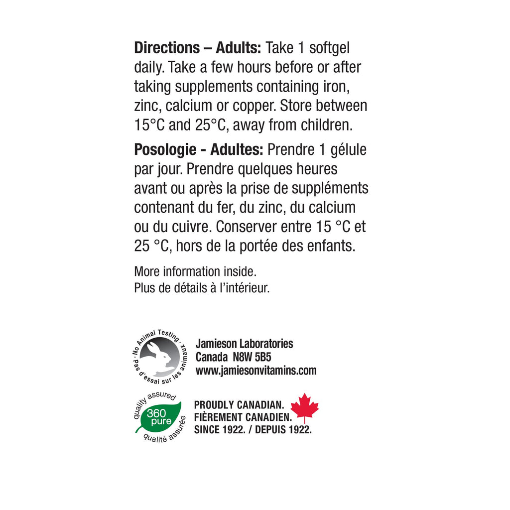 Adults: Take 1 softgel daily. Take a few hours before or after taking supplements containing iron, zinc, calcium or copper. Store between 15°C and 25°C, away from children.