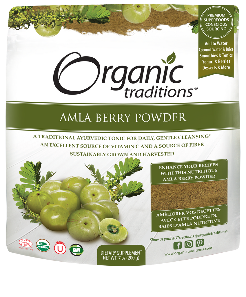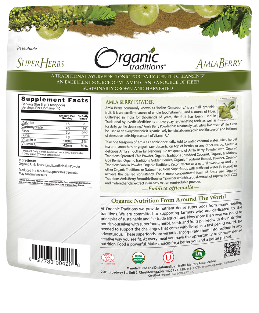 Amla berry, or Amalaki commonly known as Indian Gooseberry, is a small, greenish fruit with a tart, sour taste. It is a source of whole food Vitamin C and Fiber. One teaspoon of powder provides 42 mg of whole food Vitamin C. Cultivated in India for thousands of years, the fruit has been used in Traditional Ayurvedic Medicine as rejuvenating tonic beneficial for balancing the body and for aiding daily, gentle cleansing and detoxification. It is one of the ingredients in Triphala, Ayurvedas most common herbal formulas. In traditional Ayurveda, Amla is sattvic in nature and is therefore a good general tonic for daily use. According to the energetic principles of Ayurveda, Amla is sour, sweet, pungent, bitter and astringent in the Rasa taste energy, cooling in action according to Virya and balancing for all doshas, particularly for Pitta constitutions in need of cooling energy. Amla berry powder has a naturally tart, citrus like taste. While it can be used as an everyday tonic, it is particularly beneficial during cold and flu season and in times of stress due to its high content of Vitamin C.