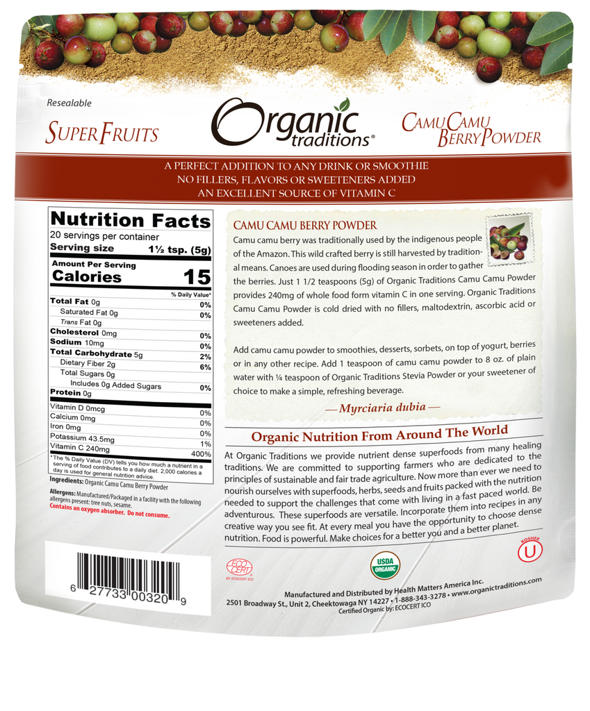 Camu Camu Berry is a traditional superfruit prized by the indigenous people of the Amazon. These berries are natures richest source of whole food Vitamin C in addition to other antioxidants such as anthocyanins, flavonols and ellagic acid. The concentration of antioxidants gives Camu Camu an incredibly high ORAC value of 3,000 per 1 tsp. 5 gram serving. The ORAC value is a measurement of the antioxidant capacity of different foods.