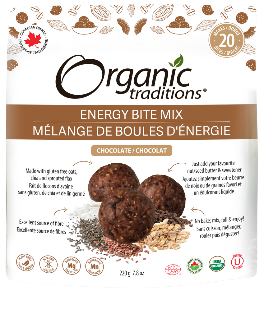Makes 20 energy bites. Pour dry mix, nut/seed butter and liquid sweetener into a medium sized bowl. Stir until well combined. Roll mixture with hands to form bite-sized balls. Store energy bites sealed and chilled in an airtight container for up to 7 days.
