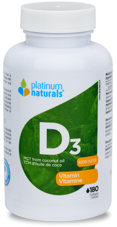 Platinum Naturals’ Vitamin D3 provides you with 1,000 IU of vitamin D suspended in medium chain triglycerides (MCT), a form of fatty acid derived from coconut oil that increases the absorption of fat-soluble nutrients.