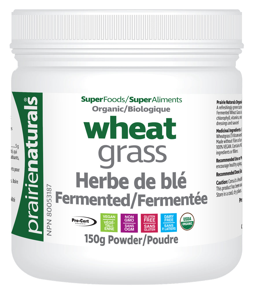 Fermented and enlivened with health-promoting prebiotics, Prairie Naturals Fermented, Organic Wheat Grass is more easily digested than other wheat grass. Prairie Naturals organic, fermented Wheat Grass is an alkaline-balancing, nutrient-dense, green superfood with energizing, cleansing, mineralizing and anti-aging properties. Harvested as young leafy greens, wheat grass is a concentrated green superfood with alkaline-balancing, energizing, cleansing, mineralizing, anti-inflammatory and anti-aging properties. A pure and simple fermented green-food powder for the whole family. Made without fillers of any sort, it is a pure and simple fermented whole food powder for the whole family. 100% Vegan. Contains N0 soy, dairy, eggs, gluten, flavours, colours, preservatives, sweeteners or GMO ingredients or fillers.