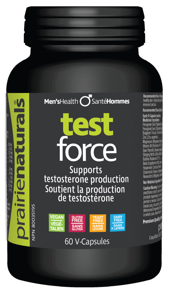 New Prairie Naturals Test Force is formulated with therapeutic doses of Standardized extracts of: Fenugreek, Bulgarian Tribulus Terrestris, Saw Palmetto, Stinging Nettle, ZMA, Chamomile and Hesperidin Complex which support the biological systems that encourage optimal natural testosterone levels.