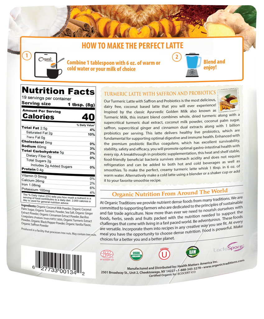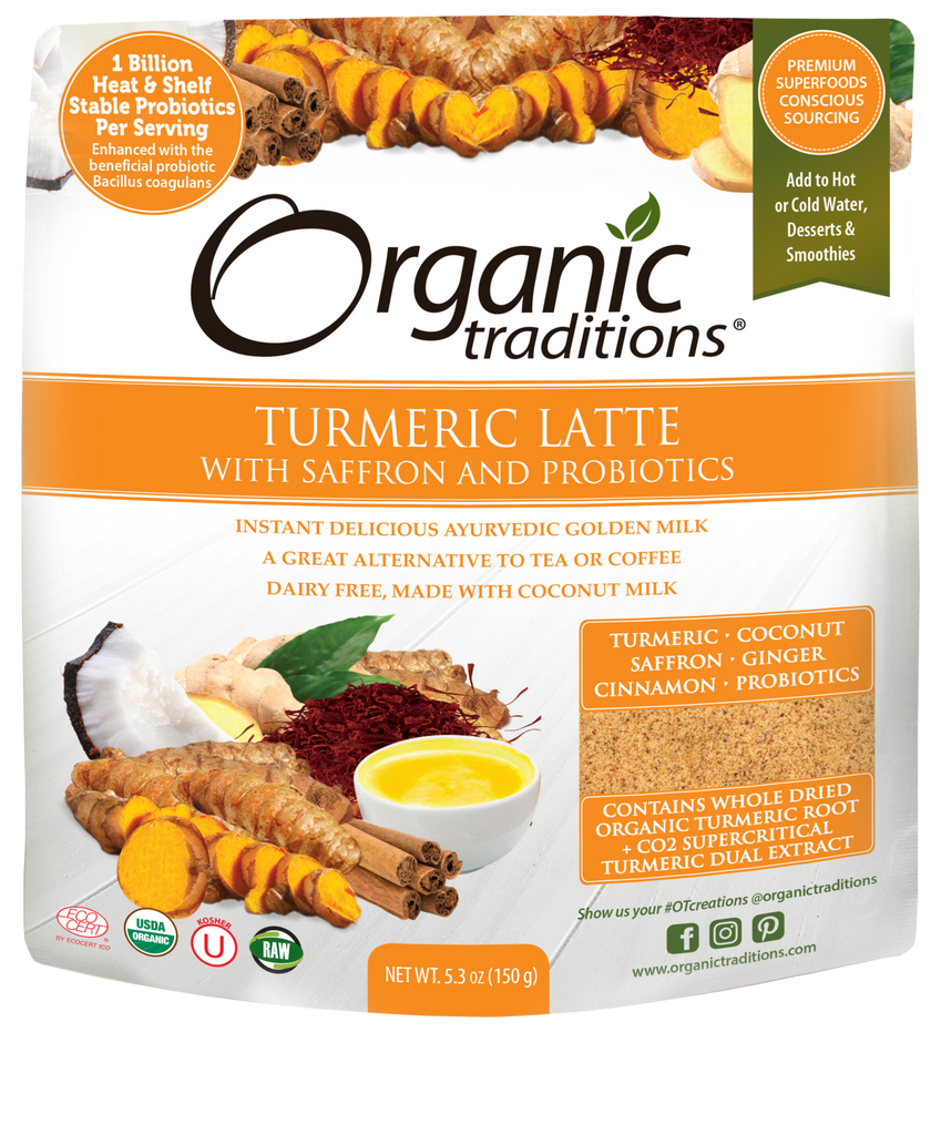 Inspired by the classic Ayurvedic Golden Milk, our Turmeric Latte with Probiotics is a blend of whole, dried turmeric root, supercritical dual extract turmeric, saffron and dual extract ginger and cinnamon. Lightly sweetened with coconut palm sugar with a coconut milk powder base, enjoy an instant turmeric latte by blending together 1 tbsp of our latte mix with 6oz of hot water. We've also added 1 billion heat and shelf stable probiotics to nourish your gut microbiome with every sip!