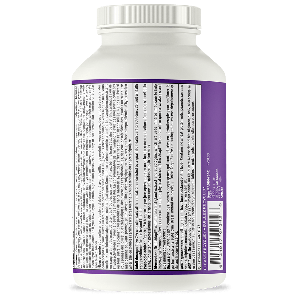 AOR’s Ortho Adapt™ targets adrenal support from three different angles: adrenal extract to supply all the needs of the adrenals, orthomolecules to prevent deficiencies of key co-enzymes, and adaptogenic botanicals to modulate the stress response. AOR™ uses whole licorice extract, as opposed to deglycyrrizinated licorice extract, since it is the glycyrrhizin in licorice that benefits the adrenals. Ortho Adapt™ is also available in a vegan formula without the glandular extract.