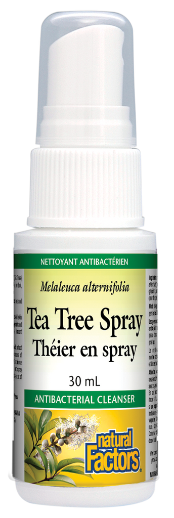Natural Factors Tea Tree Spray is a natural antibacterial cleanser in a convenient spray bottle. A quick spritz works as a topical first-aid treatment to disinfect cuts and scrapes. Tea tree oil is also used to treat head lice and nits, relieve acne and eczema, and as a natural insect repellant.