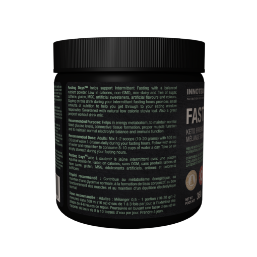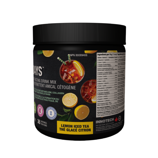 Fasting Days™ Lemon Iced Tea is formulated by Innotech Nutrition to help support Intermittent Fasting with a balanced nutrient powder. Low in calories (Keto Friendly), non-GMO, non-dairy and free of sugar, gluten, MSG, artificial sweeteners, artificial flavours and colours. With 10 grams of amino acids, 13 vitamins and minerals including your daily electrolyte requirement. Drink this during your 18-20 hour fast.