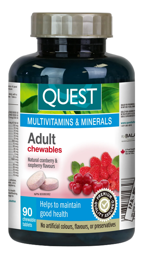 Quest Adult Chewable Multivitamin is a superior multivitamin and mineral supplement for those who have trouble swallowing large tablets, and yet are still looking for a quality multivitamin. These delicious cranberry and raspberry flavoured tablets provide all the essential antioxidants, vitamins, and minerals necessary to support a typical, adult lifestyle.