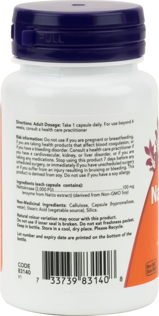 Nattokinase is an enzyme isolated from Natto, a traditional Japanese fermented soy food. Natto has been consumed for thousands of years for its numerous health promoting properties. More recently, both clinical and non-clinical studies have demonstrated that Nattokinase can help to promote heart and circulatory health by supporting normal blood clotting functions. NOW® Nattokinase is derived from non-GMO soy and has 2,000 FUs (Fibrinolytic Units) of activity per 100 mg capsule.