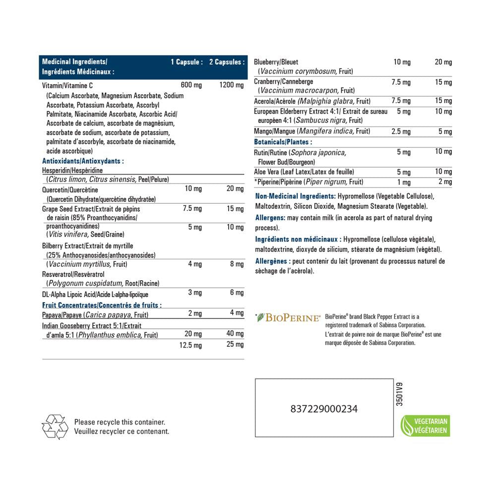 | Vitamin C (Calcium Ascorbate, Magnesium Ascorbate, Sodium Ascorbate, Potassium Ascorbate, Ascorbyl Palmitate, Niacinamide Ascorbate, Ascorbic Acid). | 600 mg |