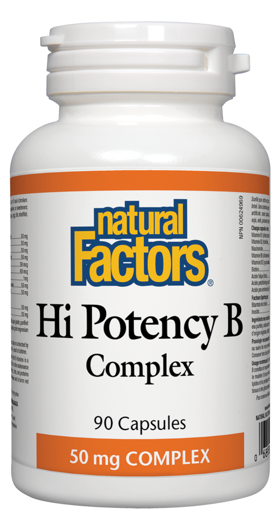 Natural Factors Hi Potency B Complex is a one-per-day formula that provides the full spectrum of all essential B vitamins. Each capsule contains a 50 mg potency that enhances energy levels by helping the body metabolize carbohydrates, proteins, and fats, as well as supporting red blood cell formation.