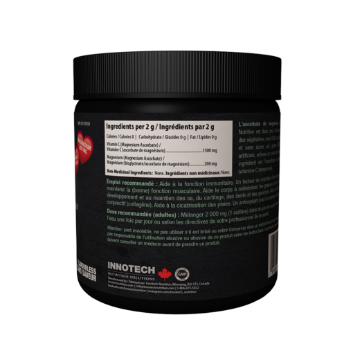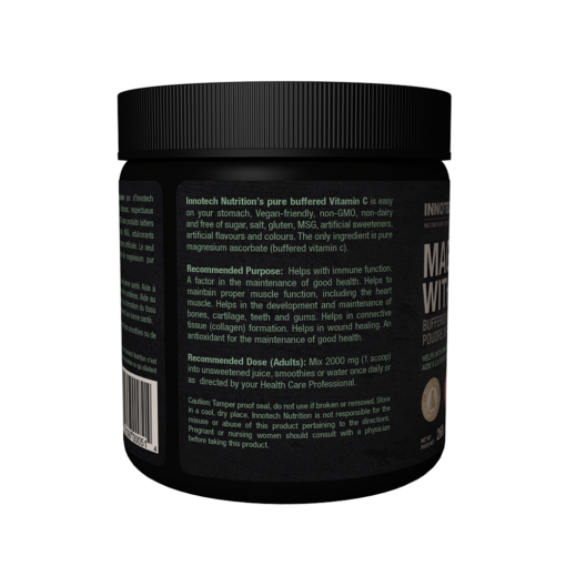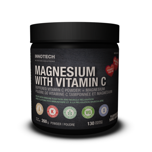 Innotech Nutrition’s pure Magnesium with Vitamin C is easy on your stomach, Vegan-friendly, non-GMO, non-dairy and free of sugar, salt, gluten, MSG, artificial sweeteners, artificial flavours and colours. The only ingredient is pure magnesium ascorbate (buffered vitamin c).
