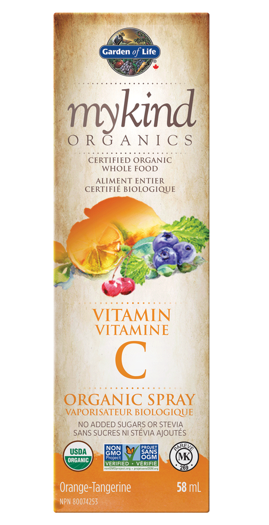 mykind Organics Certified Organic Whole Food Vitamin C Spray is designed to deliver Certified USDA Organic, Non-GMO Project Verified Vitamin C from real food in an easy-to-use liquid form. A daily dose of five sprays provides 60 mg of vitamin C without any artificial ingredients or chemical preservatives and no added sugars —just wholesome organic food with a delicious Cherry-Tangerine or Orange Tangerine taste.
